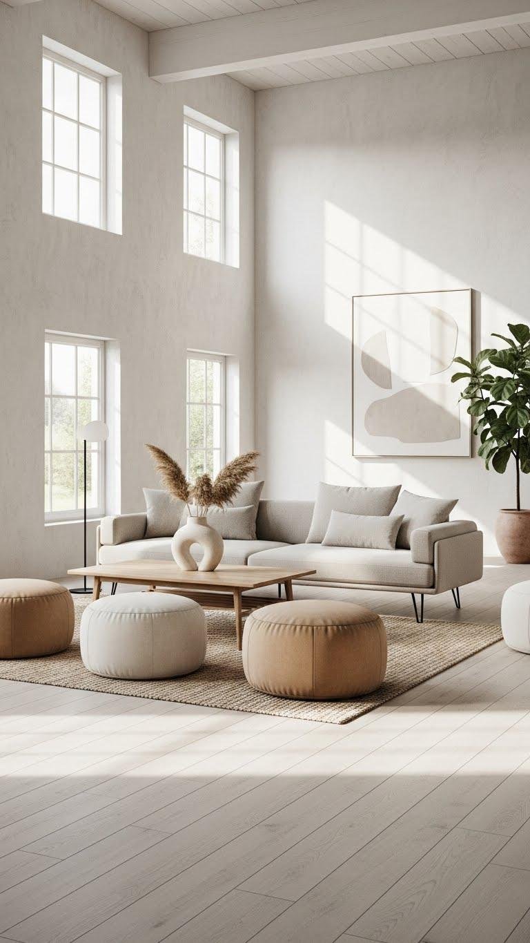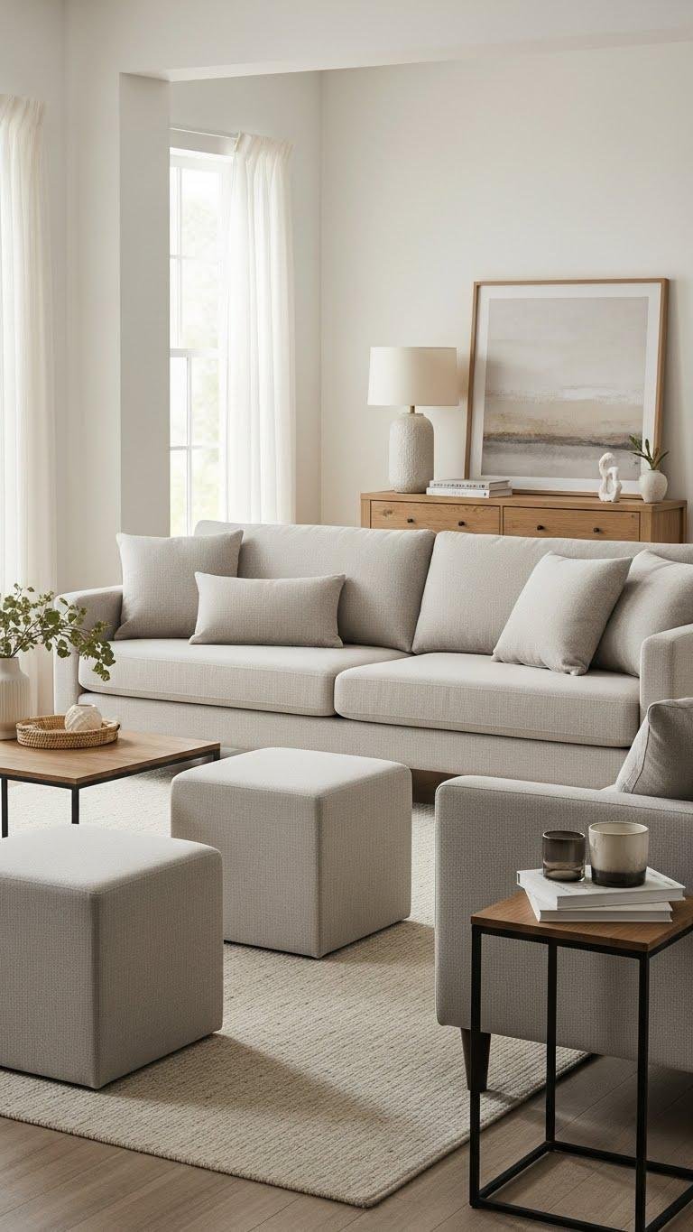 Mix a streamlined sofa with squared ottomans for flexible seating and clear sightlines.