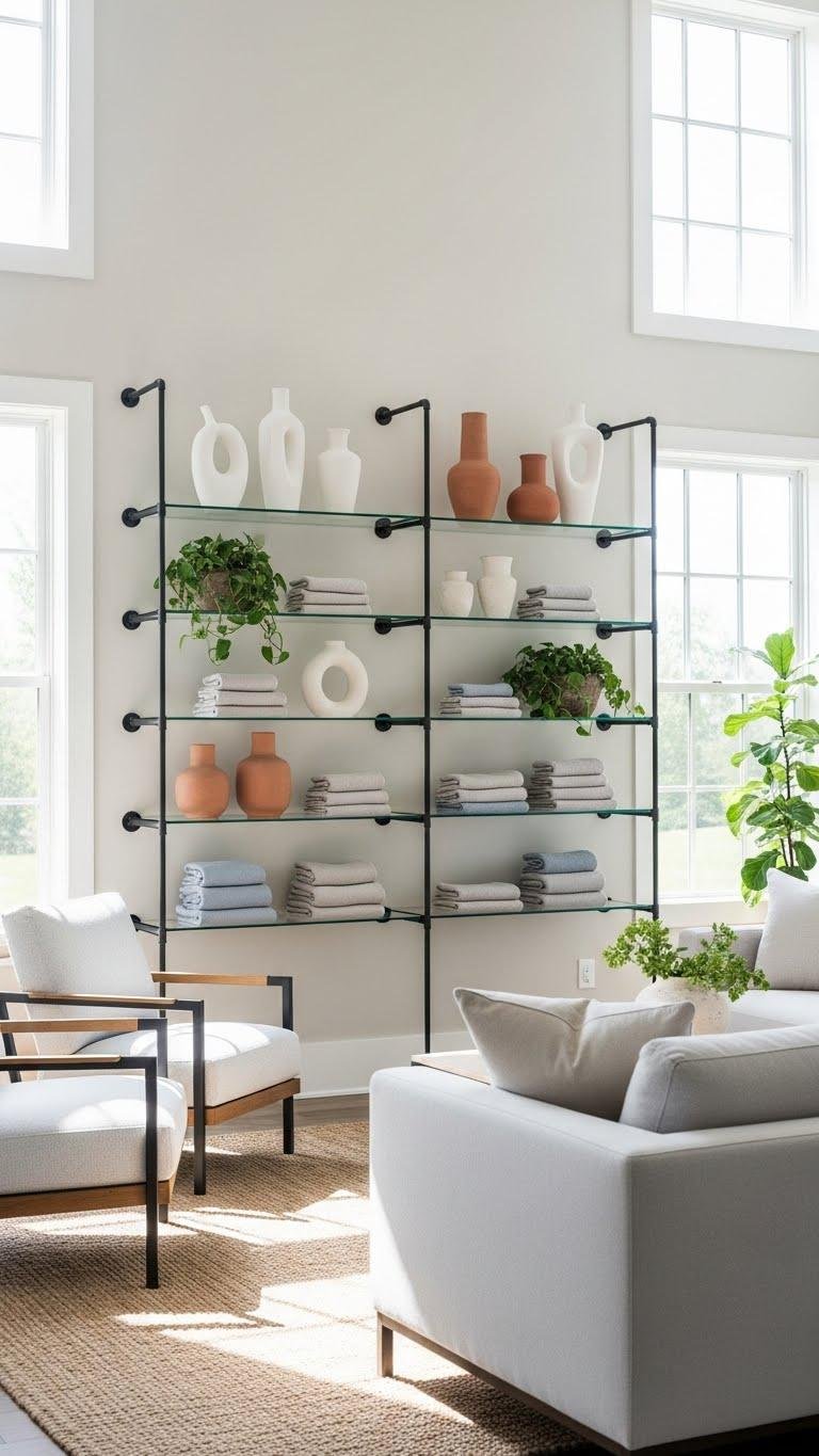 After you’ve settled on clean-lined seating, lighten the rest of the room with open glass shelving that keeps sightlines clear and surfaces feeling airy. You’ll mount tempered shelving on minimal industrial pipework for strength without bulk.