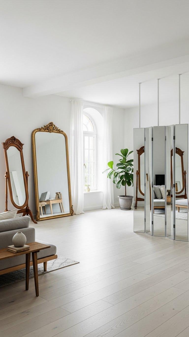 Bring a large mirror into the room to instantly double light and depth—lean it against a wall opposite windows or hang it to reflect a favorite vignette. Choose an antique cheval mirror for character or a sleek mirrored room divider to define zones without blocking air or sightlines.