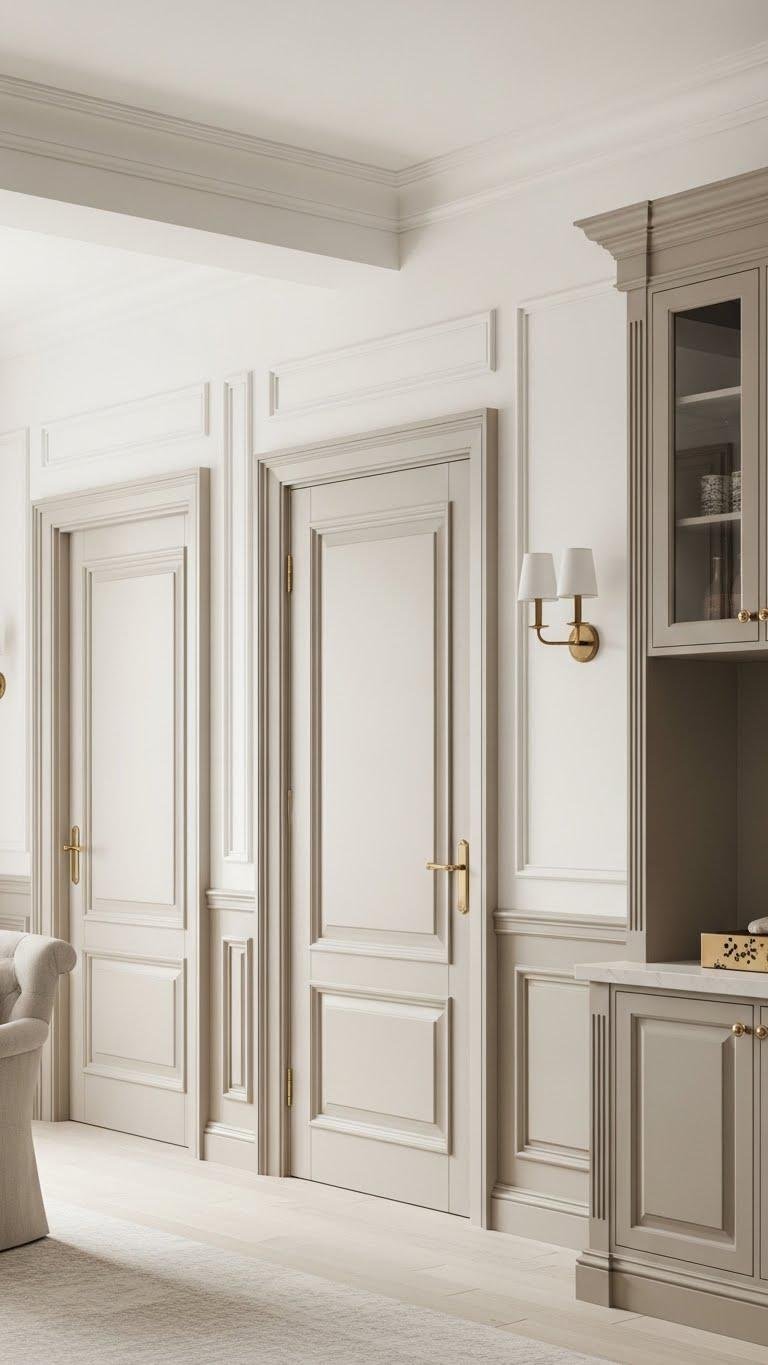 If you want millwork to feel intentional rather than an afterthought, paint it in soft neutral tones that complement your warm white walls and add subtle contrast.