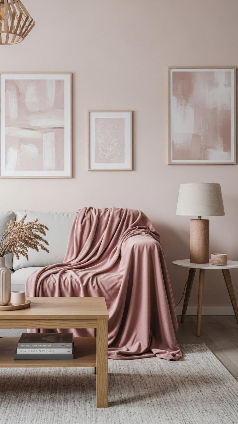 Mix matte surfaces with velvet textures for depth, and let restrained pinks free the room from starkness while keeping the mood calm and open.