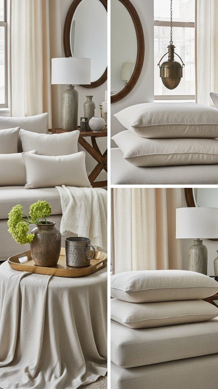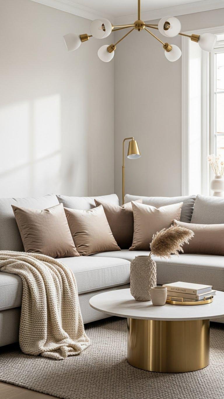 Layer plush textiles—velvet cushions, boucle throws, and a low-pile wool rug—against a restrained neutral palette and let warm gold accents punctuate the composition.