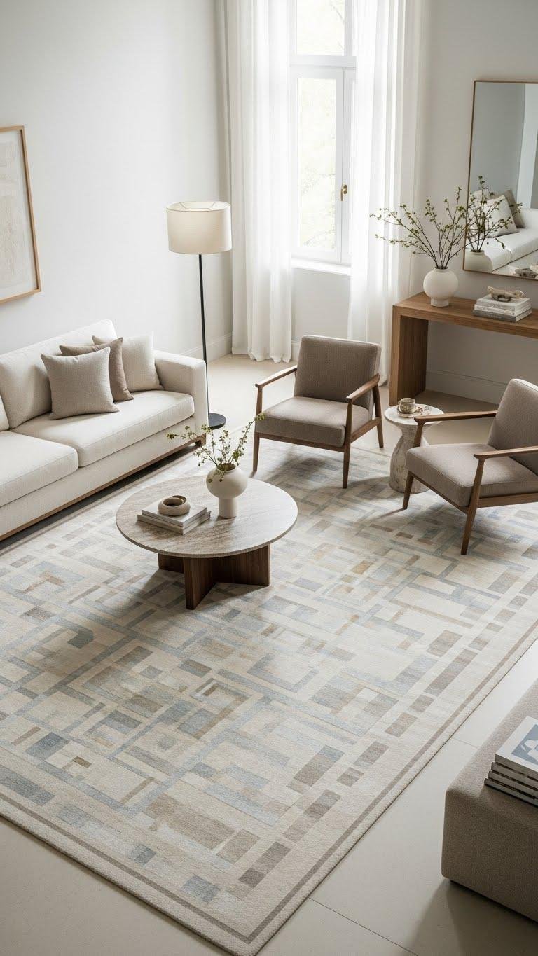 Favor geometric layering for interest—overlapping scales, muted motifs—and let tactile restraint and clean proportion offer freedom, so your space breathes without fuss.