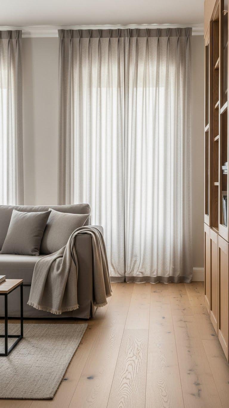 You’ll favor soft wood tones paired with muted sateen throws and linen matte curtains that diffuse sunlight.