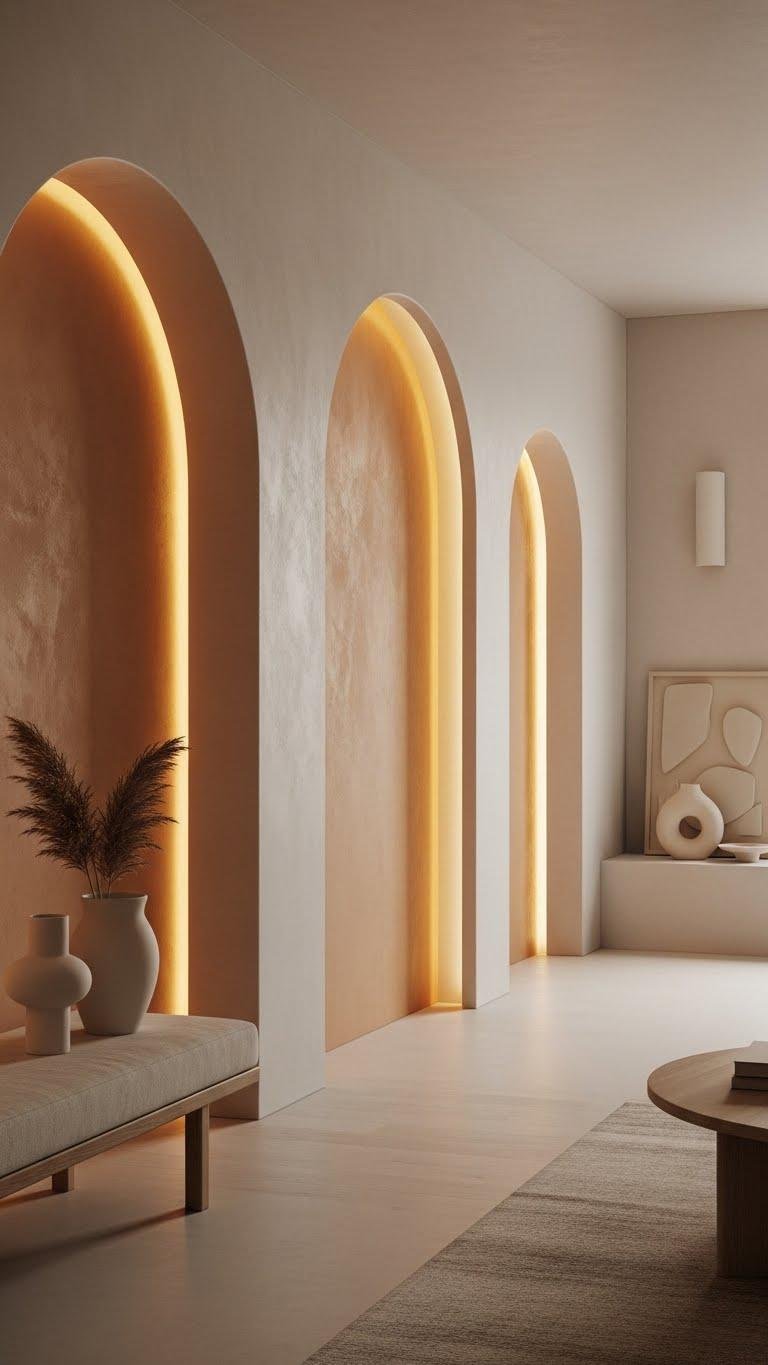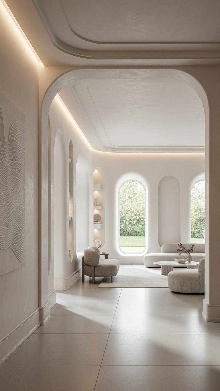 Choose subtle plaster finishes, minimalist trim, and uncluttered furnishings so each curve reads as intentional. You’ll create calm, freeing spaces that feel quietly sophisticated.