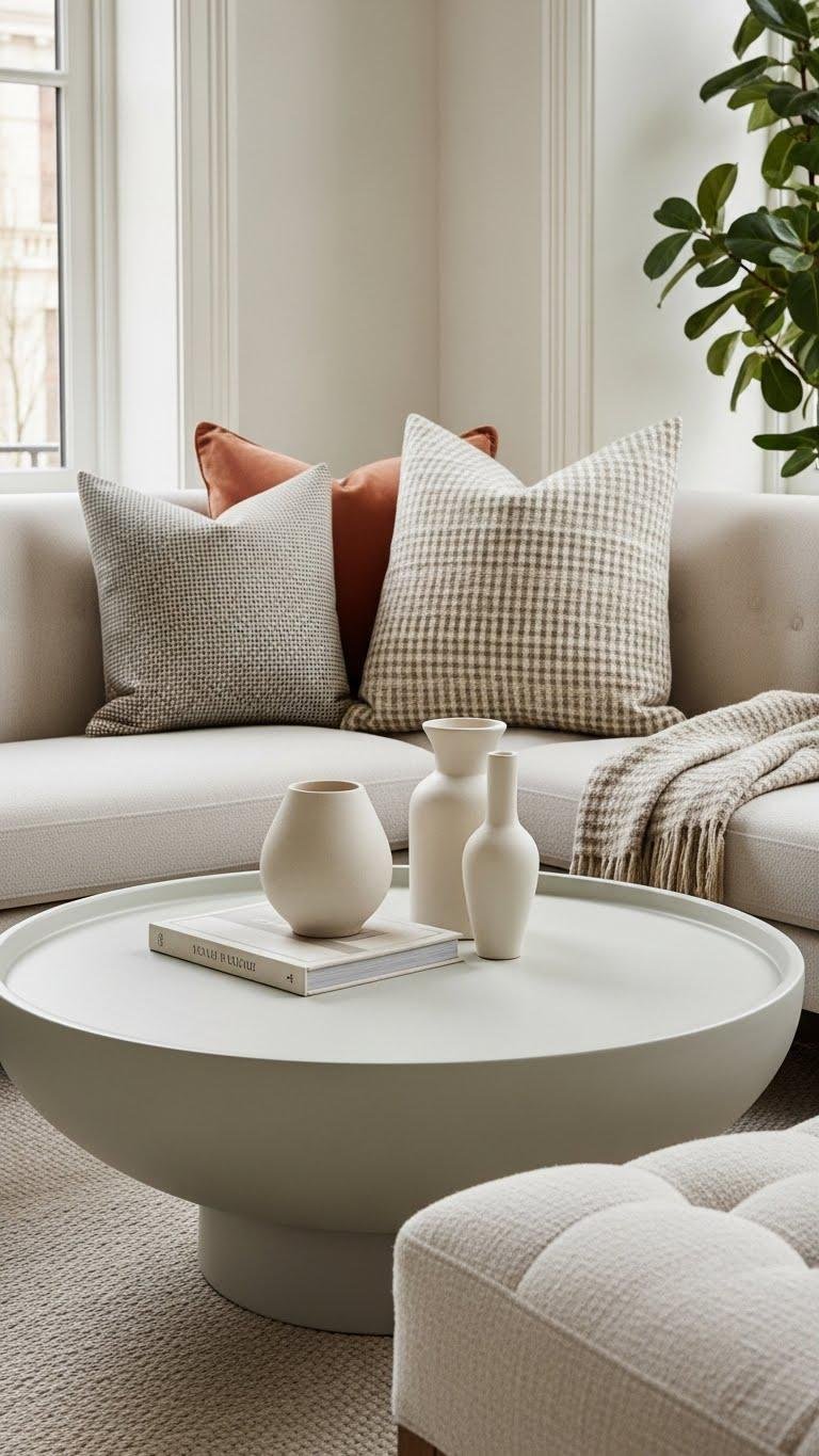 Set a low, pale round table in the center of your seating area to quietly contain and soften the room’s flow. Choose a shallow pedestal in matte porcelain to anchor conversations without imposing.
