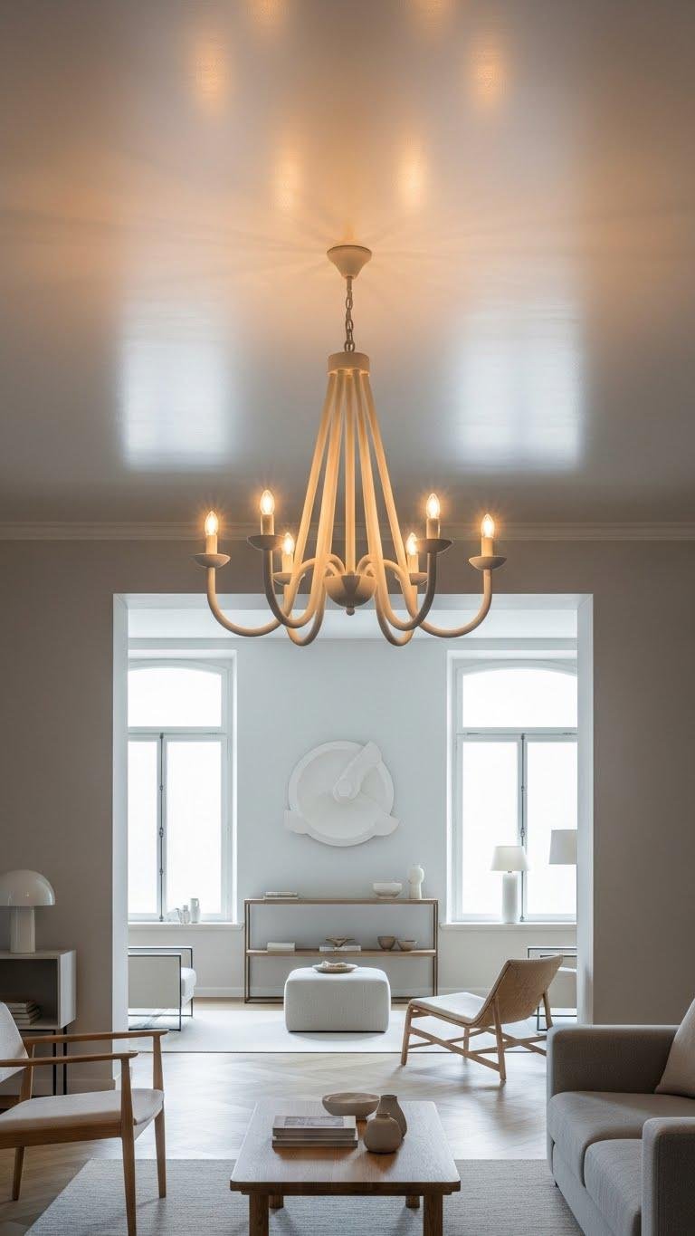 A plaster chandelier’s soft, matte glow makes a room feel composed; add a whisper of red to warm that calm without breaking the quiet.