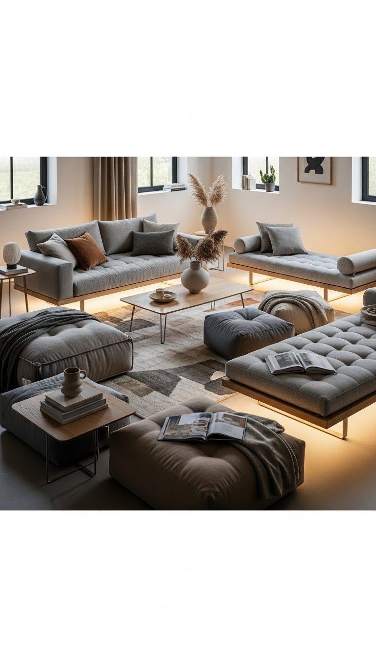 Pull in low lounge seating to ground your living area and cultivate a relaxed, intimate scale—think deep, cushioned sofas, streamlined daybeds, or grounded floor cushions that invite lingering. Choose pieces that sit close to floor level and layer modular ottomans for flexible layouts.