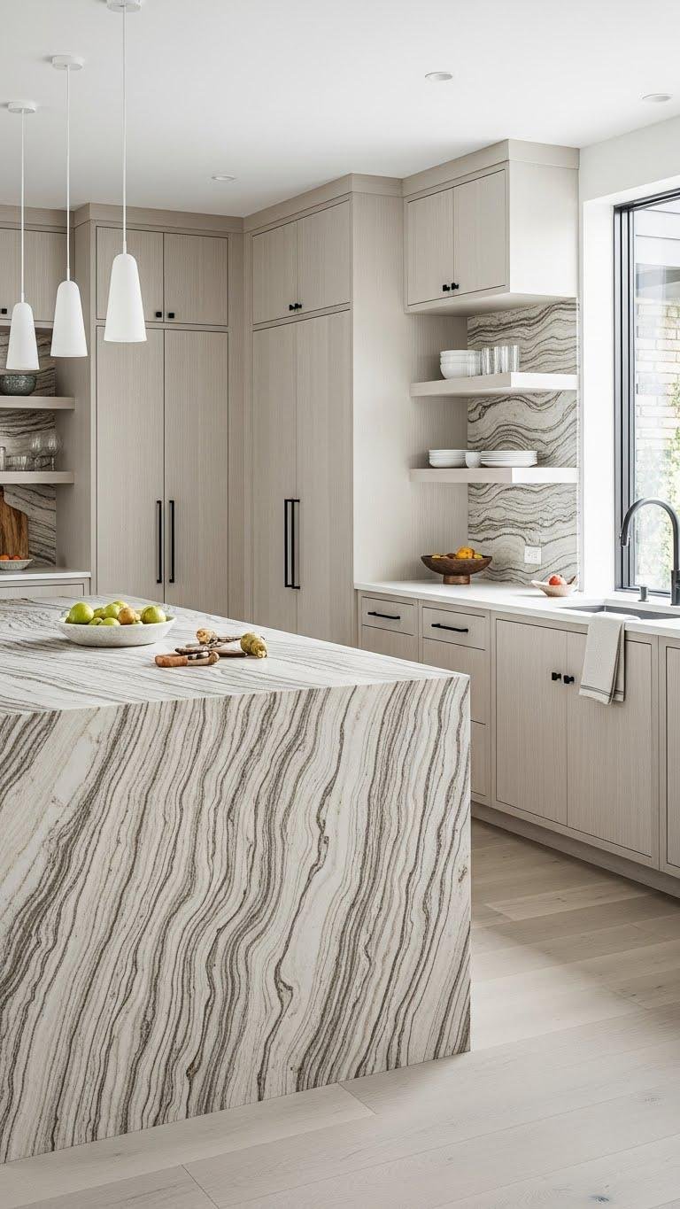 You’ll appreciate tactile veining that reads like landscape, while matte hardware keeps details restrained.