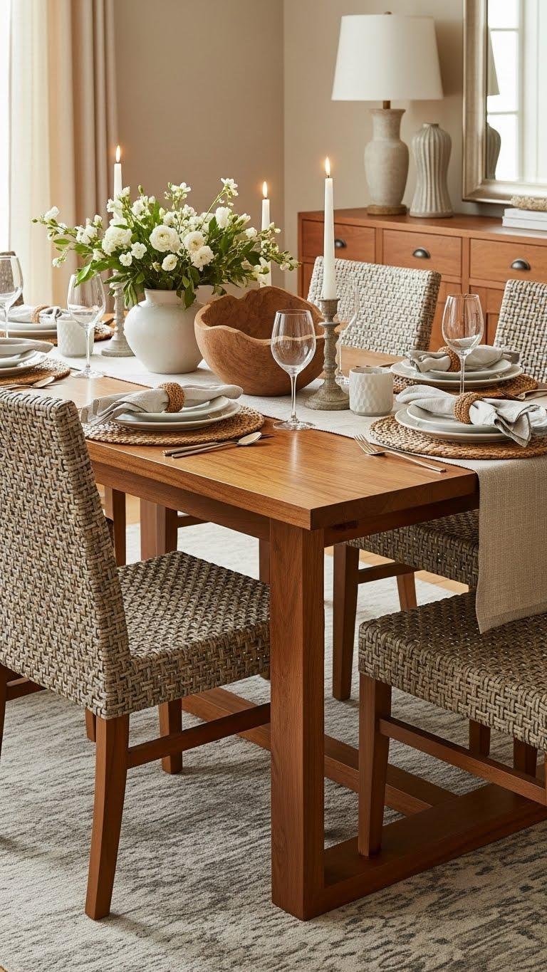 Introduce woven chairs to soften the presence of a rich wood dining table, and you’ll create a tactile, inviting centerpiece that balances weight with lightness.
