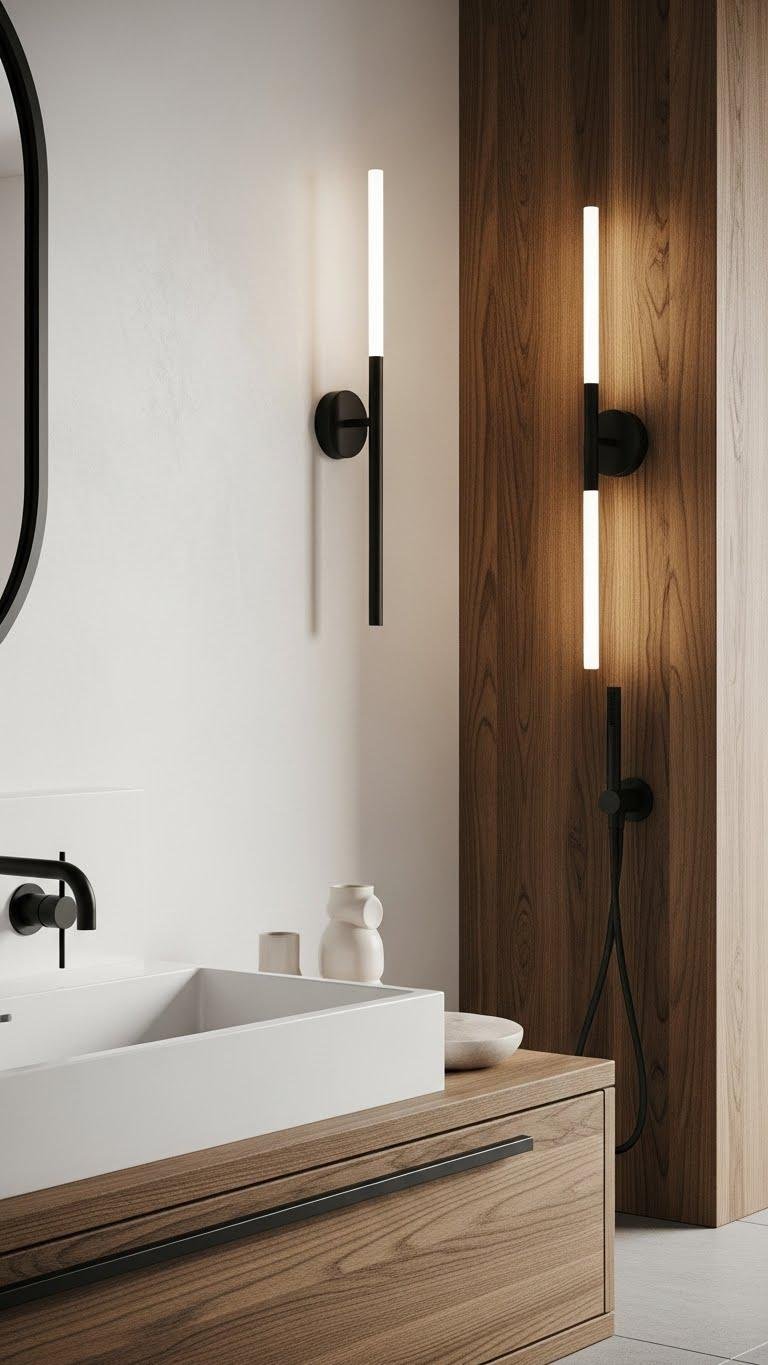 Pair slim black fixtures with warm wood finishes to carve out a crisp, modern counterpoint that still feels grounded and serene. You’ll lean into matte tracery and slender silhouettes—taps, sconces, and cabinet pulls—that punctuate grain without overpowering it.