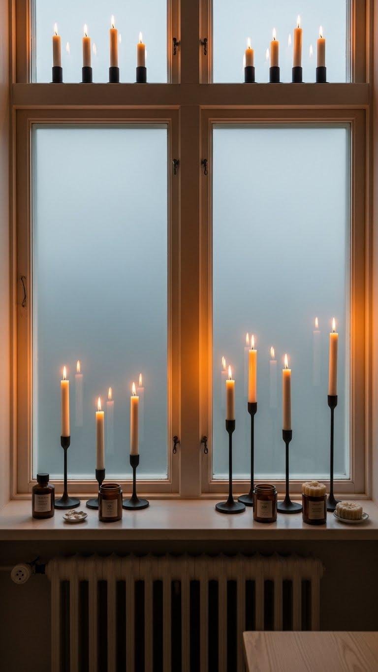 Windows dressed with flickering candles give Scandinavian rooms instant warmth and a soft focal point. You’ll curate a scented windowsill with minimal holders, choosing clean lines and natural wax scents that lift the room.
