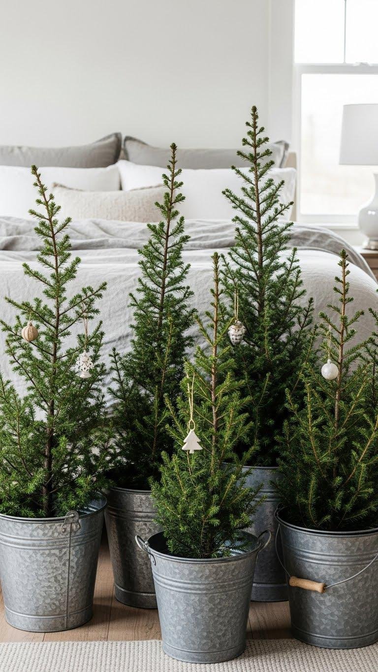 After you’ve settled into the soft, botanical calm of linen bedding, bring that same quiet nostalgia to your tree displays with simple galvanized buckets.