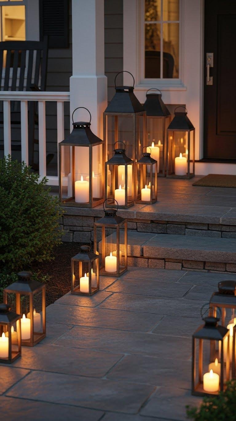 You can carry that same calm, curated vibe from your bedroom to the front porch by arranging lanterns that feel intentional, not fussy. Place rustic lanterns in groups of odd numbers, mix glass and metal, and stagger heights for depth. Line stone pathway lanterns to guide guests, add warm LED candles, and keep styling minimal so the entry feels open, free, and inviting.