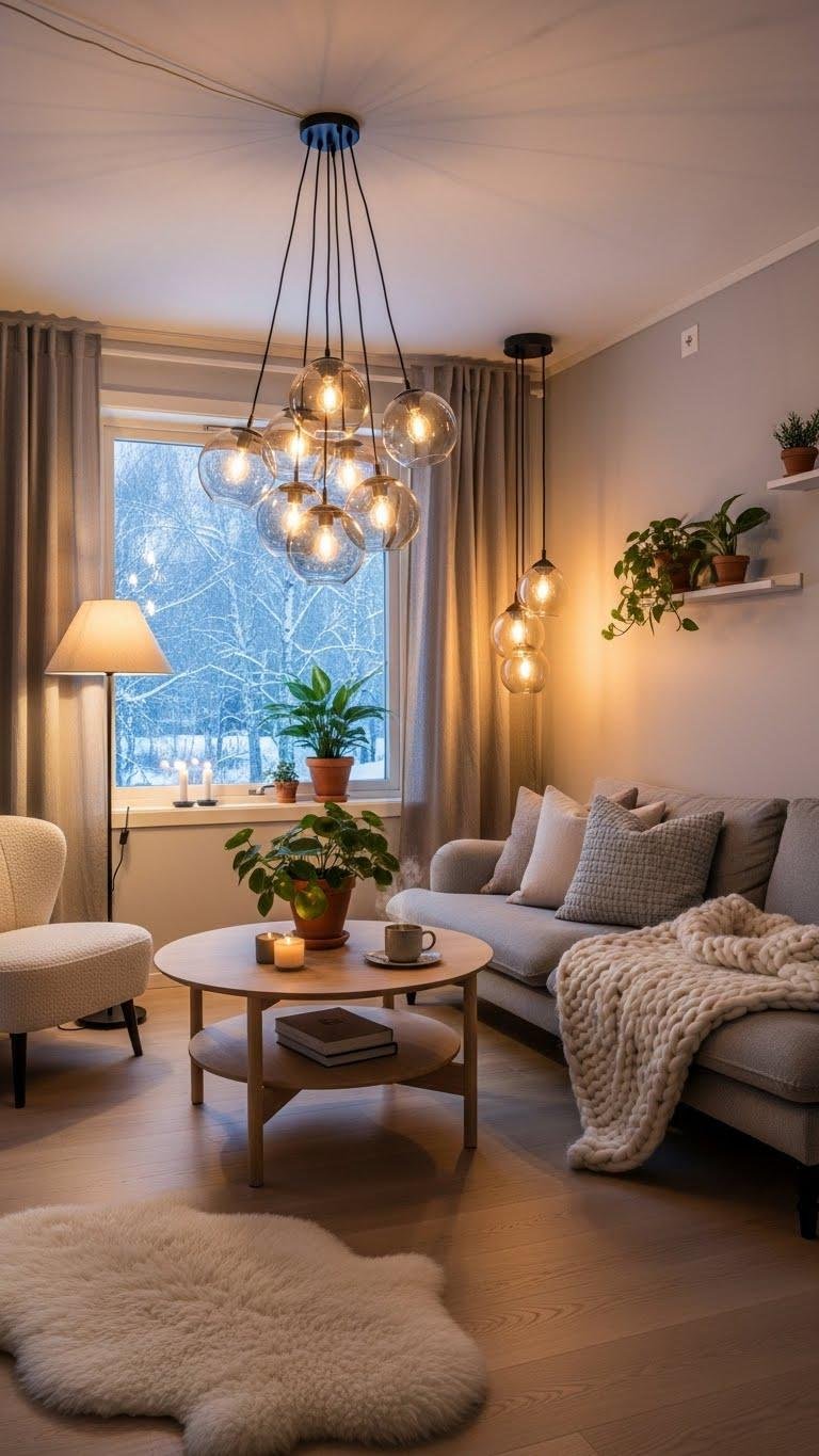 Bring a statement light fixture in to anchor your room and you’ll instantly lift the mood with a warm, Scandinavian glow. Choose dimmable pendants or sculptural fixtures with amber globes to create layered warmth. You’ll mix minimal form with tactile materials, control brightness, and carve cozy zones.