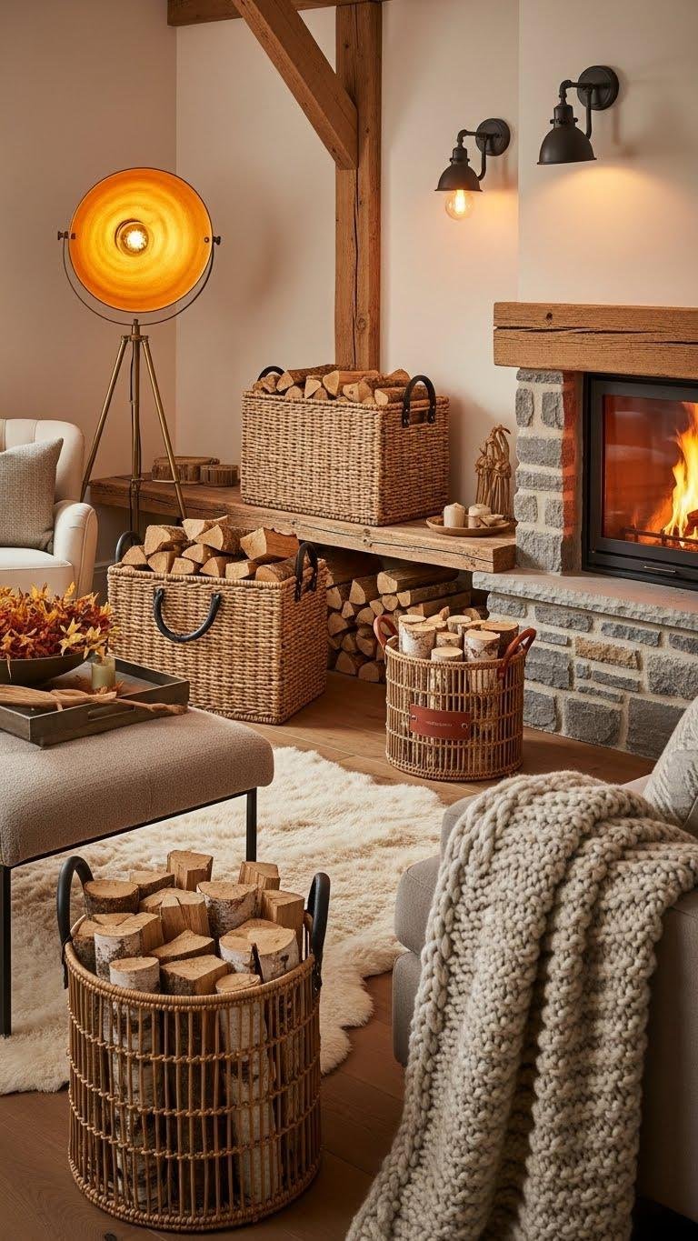 Place them near the hearth, beside a low bench or under a shelf, so storage reads like decor and you stay free to rearrange seasonally.