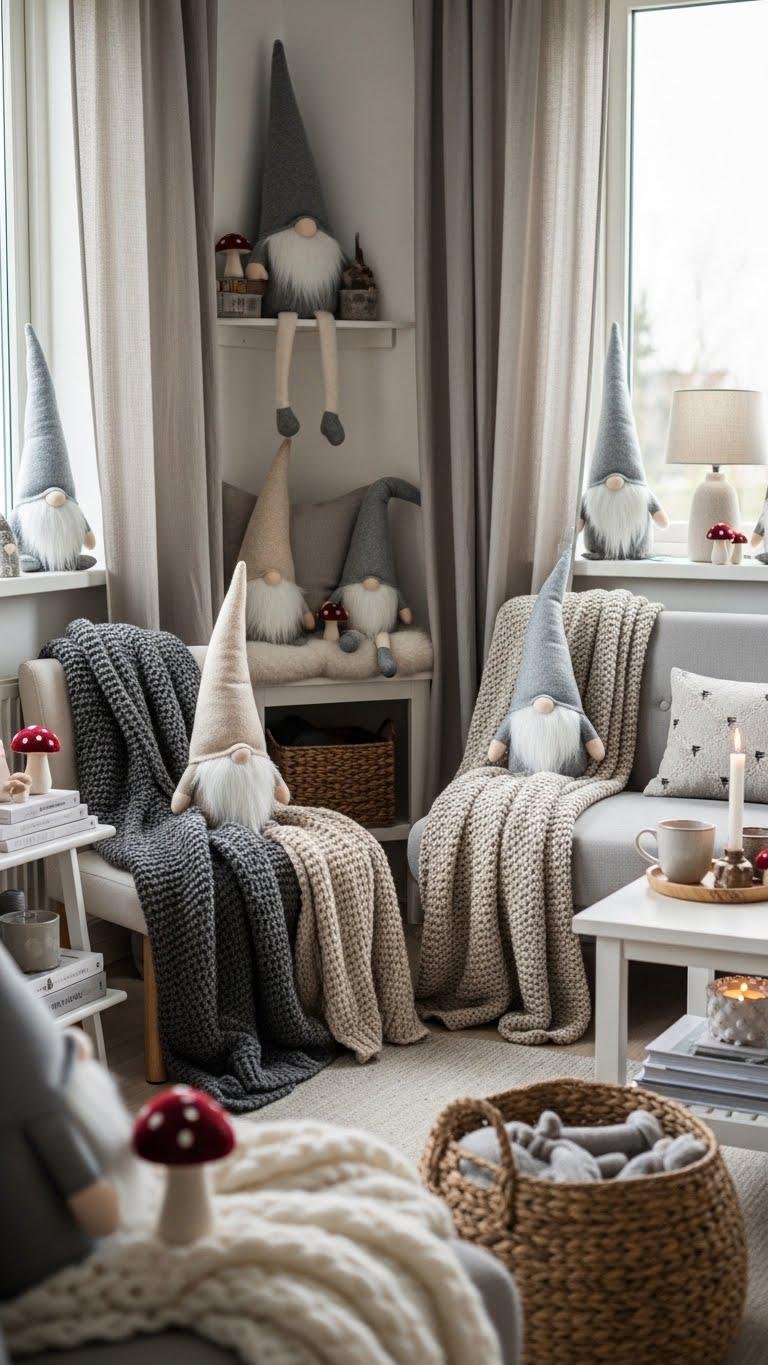 Tuck plush gnomes around seating nooks and on shelves to add a playful, Scandinavian winter vibe that feels both curated and cozy. You’ll mix felt gnomeworkshop pieces with muted linens, soft wool throws and tiny Nordic mushroomcraft accents for organic whimsy.