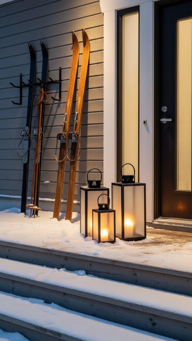 A pair of vintage skis and a cluster of lanterns can instantly define a snowy porch—lean the skis against the siding, stagger lanterns along the steps, and let candlelight glow through frosted glass to create a warm, Nordic welcome.