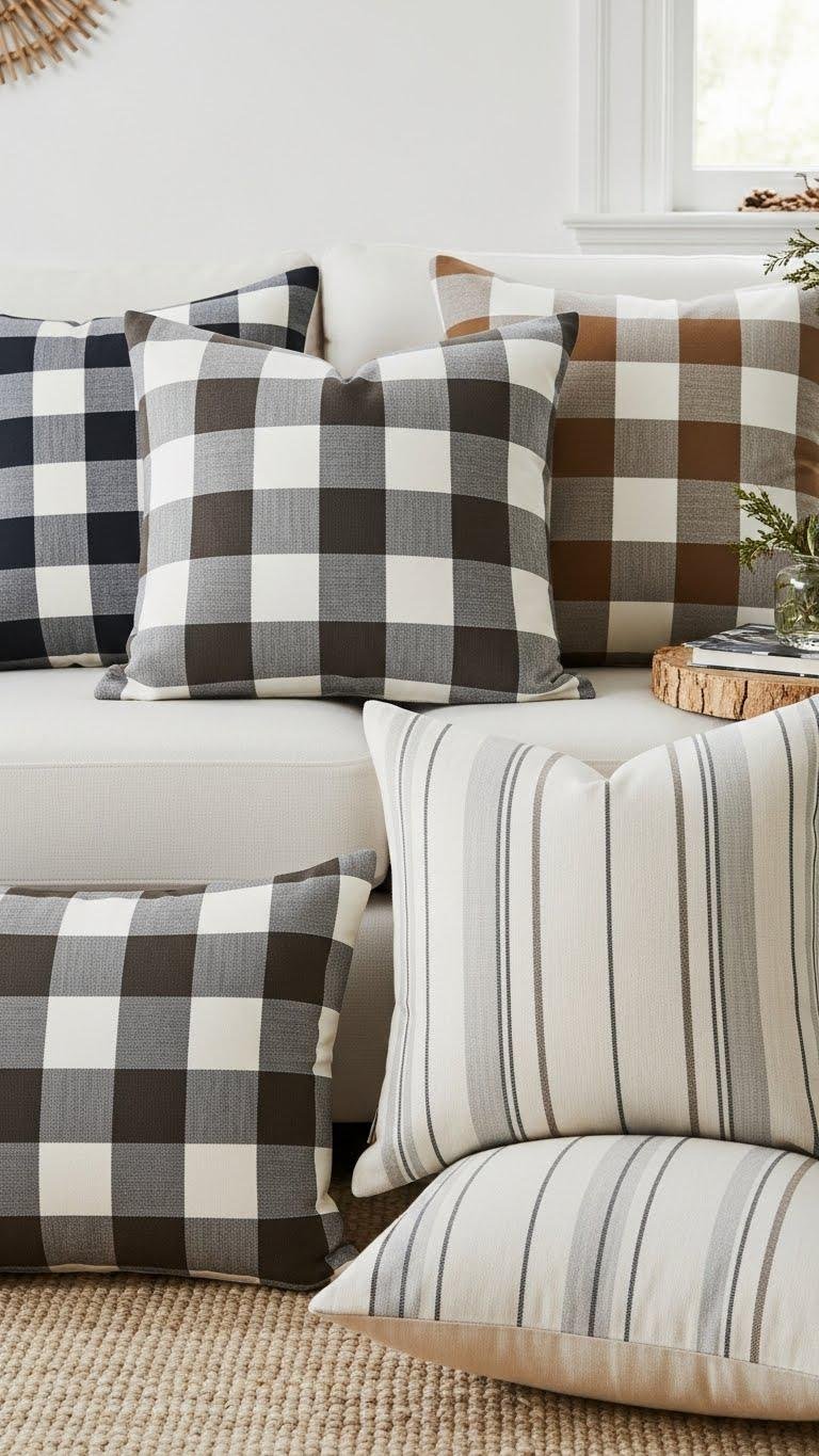 Bring in graphic charm with checkered and striped holiday pillows that snap a room into seasonal focus. You’ll mix scandi checks and minimalist stripes to create roomy contrast without clutter.