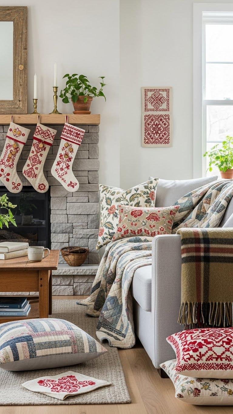 Quilted heirlooms and hand-stitched stockings add instant warmth and storytelling to a modern Scandinavian scheme, so mix faded florals, wool plaids, and simple red embroidery to balance clean lines with lived-in charm.