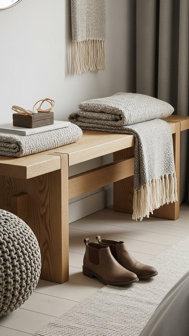 Pair a clean-lined natural wood bench with a few textured throws to anchor an entryway or bedroom—think raw oak or ash with visible grain and simple joinery.