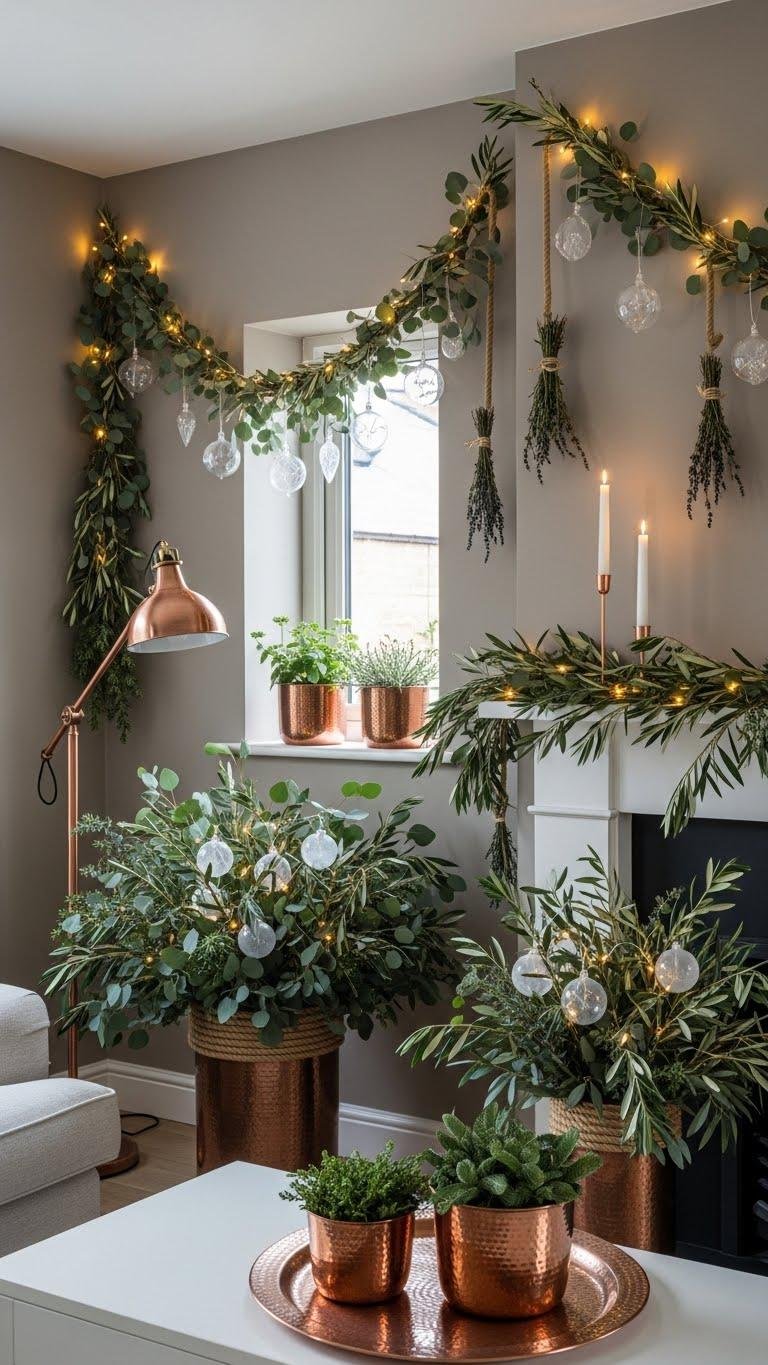 You’ll drape garlands with pea glass baubles, tuck herb bundles into branches, and anchor arrangements with sisal rope for an earthy hold. Add copper accents for warmth; the effect is minimalist, free, and quietly festive.