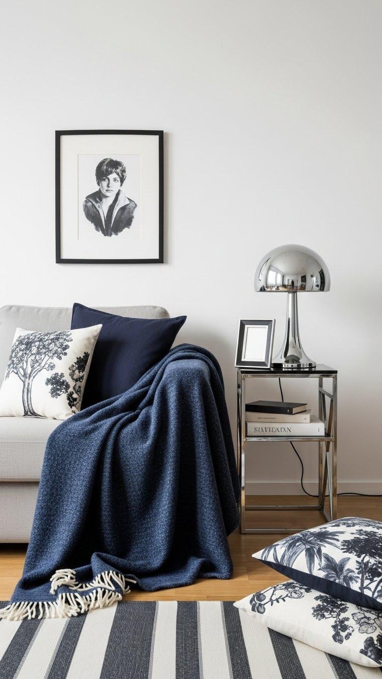 When you introduce high‑contrast accents—think black picture frames, a navy throw, or a chrome lamp—keep them small and deliberate so they sharpen the room without overpowering it.