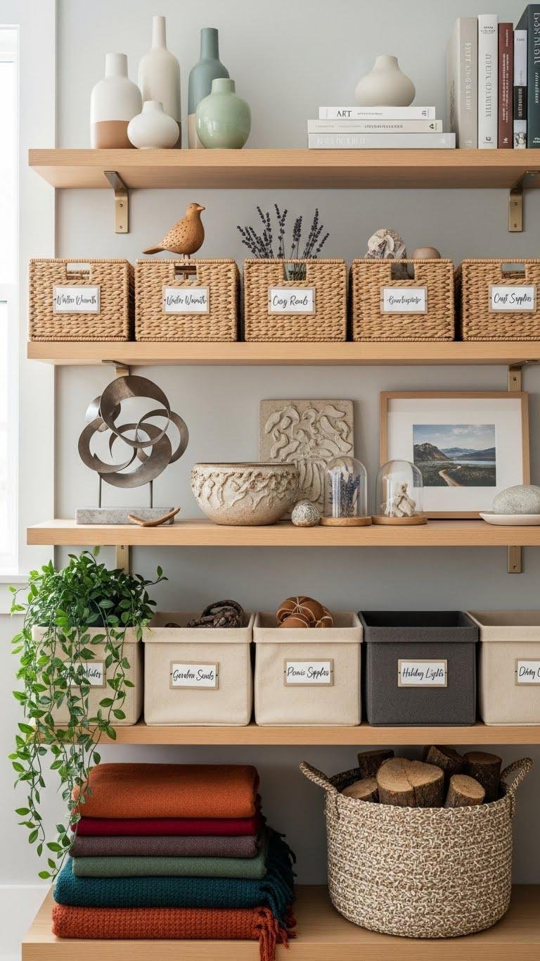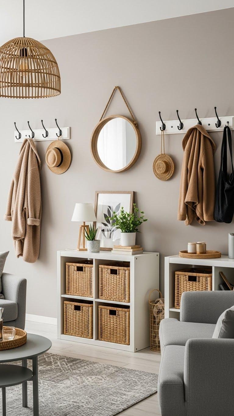 Use functional wallhooks for coats and artful organization, pair decorative baskets with open shelving to corral clutter, and pick objects that serve purpose so you move freely through a calm home.