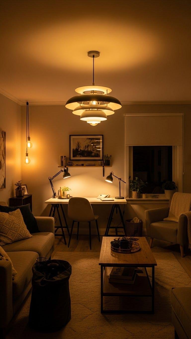 You’ll balance function and mood with warm dimmers that soften evenings and layered pendant lights over work zones for direction.
