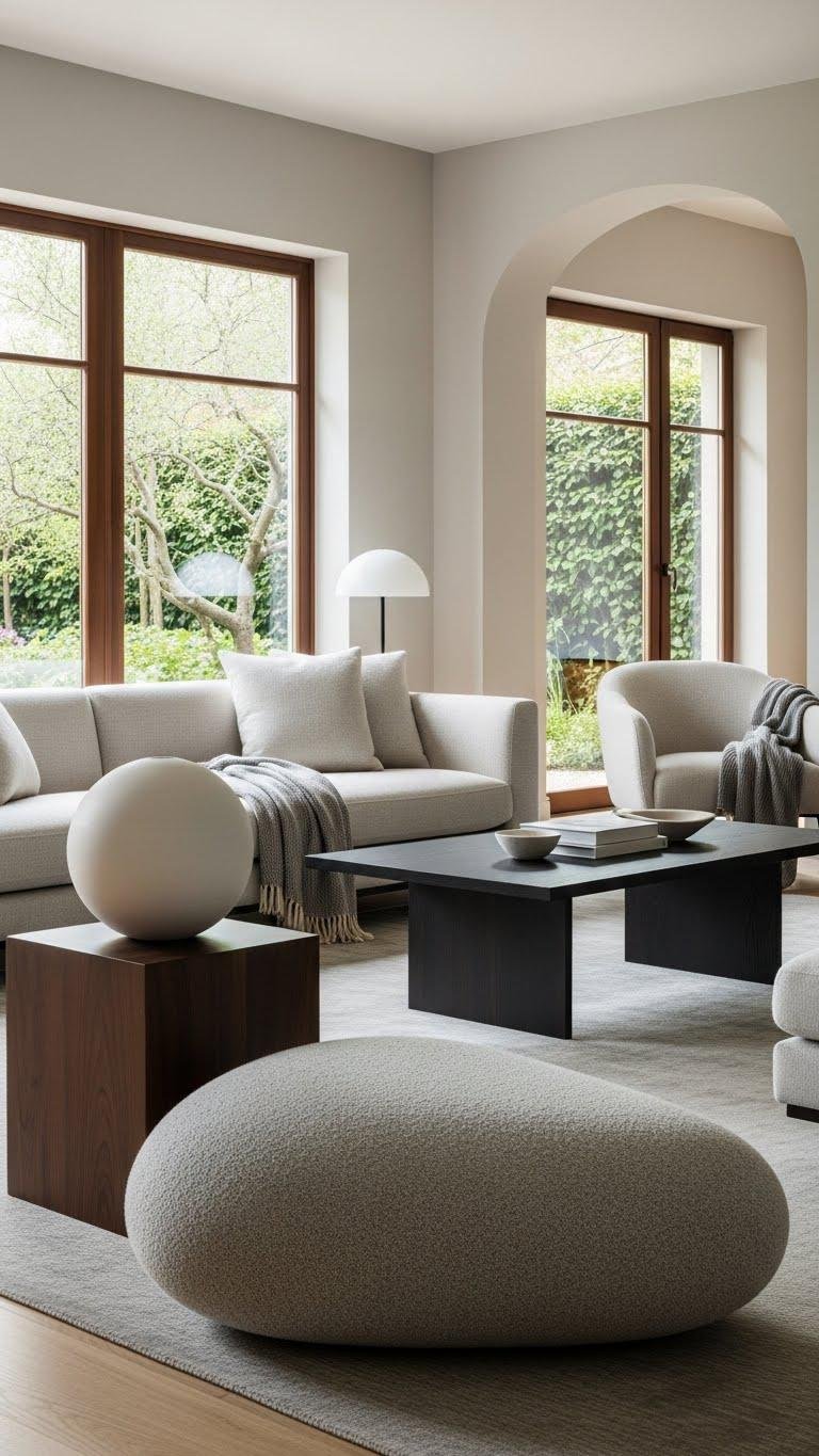 After you’ve balanced scale and cleared pathways, add a single sculptural or rounded form to soften angles and give the room a focal point. Choose a soft pebble pouf or a ceramic sphere on a low plinth to anchor a corner without clutter.