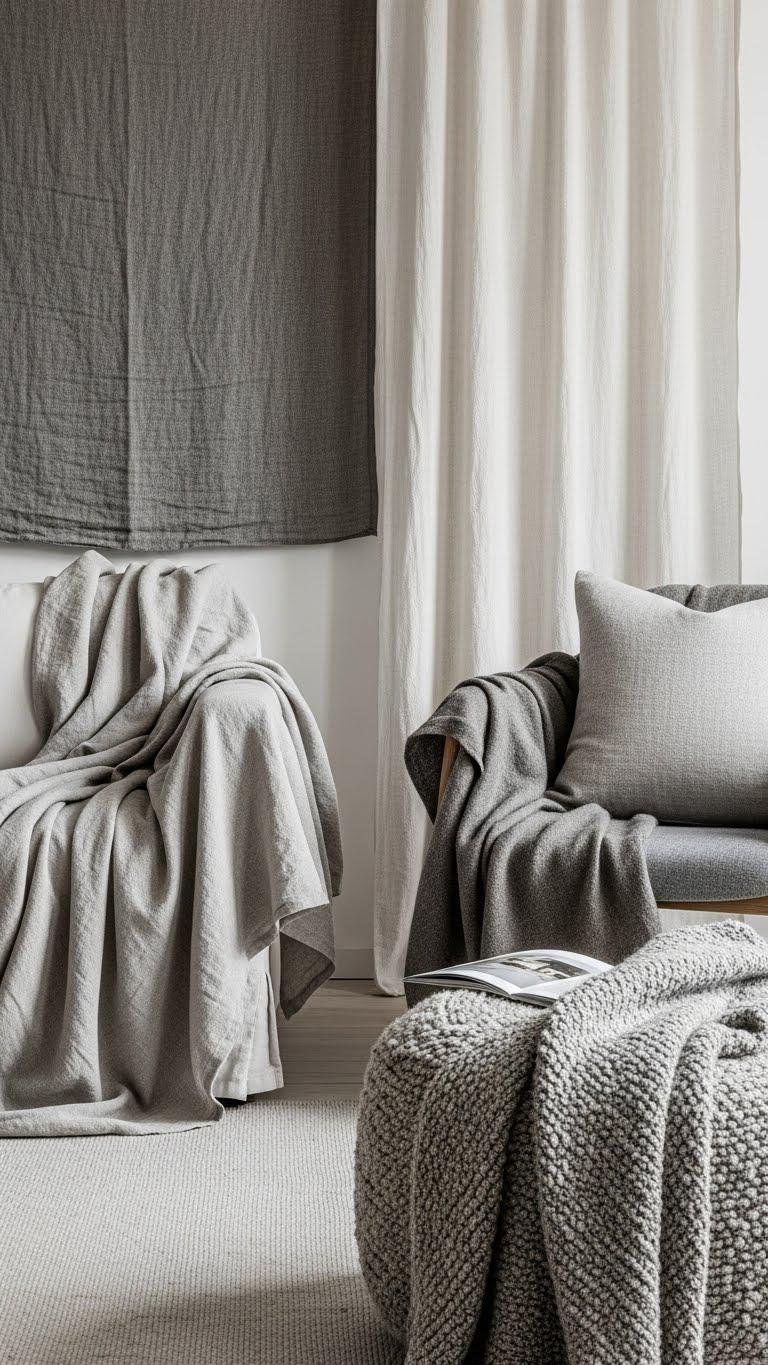 You’ll layer organic fibers to add softness without clutter, mixing coarse and smooth weaves for tactile contrast. Drape a linen throw, add a wool cushion, and keep colors muted so textures stand out.