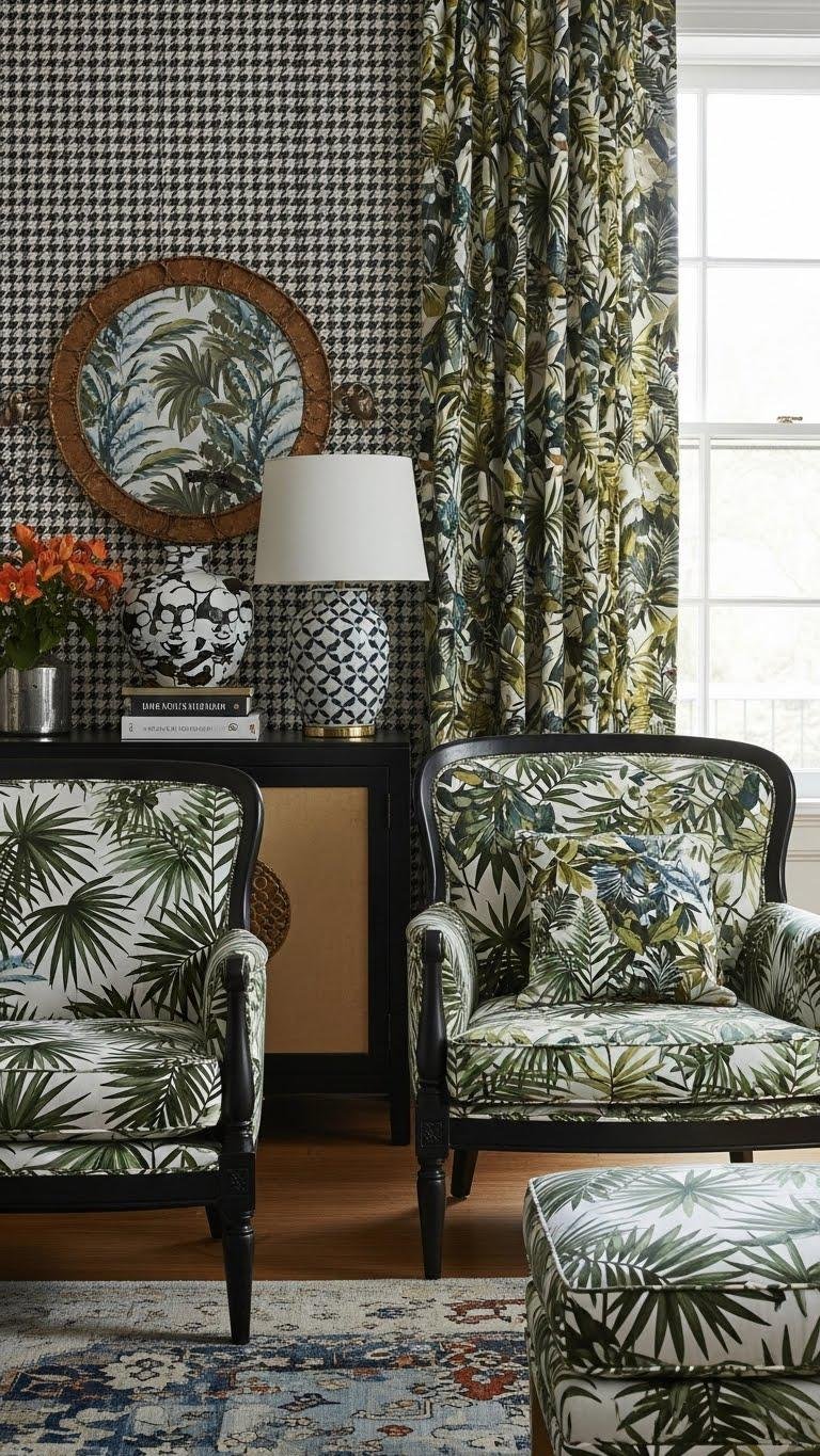 Lean into a single pattern motif to make a bold, cohesive statement—think oversized houndstooth, tropical palm fronds, or a graphic geometric repeat—and wrap the room in it across wallpaper, upholstery, and textiles so the look reads intentional rather than cluttered.