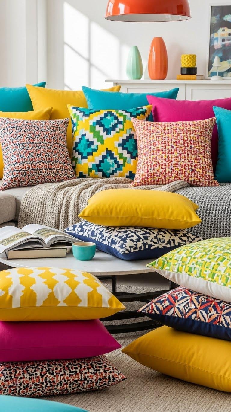 Swap your usual neutrals for a handful of vivid throw pillows to instantly lift a living room’s mood and make the seating feel edited and modern.