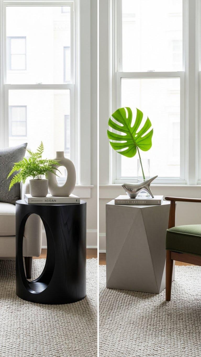 You’ll choose sculptural side tables or ceramic pedestals in bold silhouettes and restrained finishes, placing them near seating to display a plant, a book, or a sculptural object.