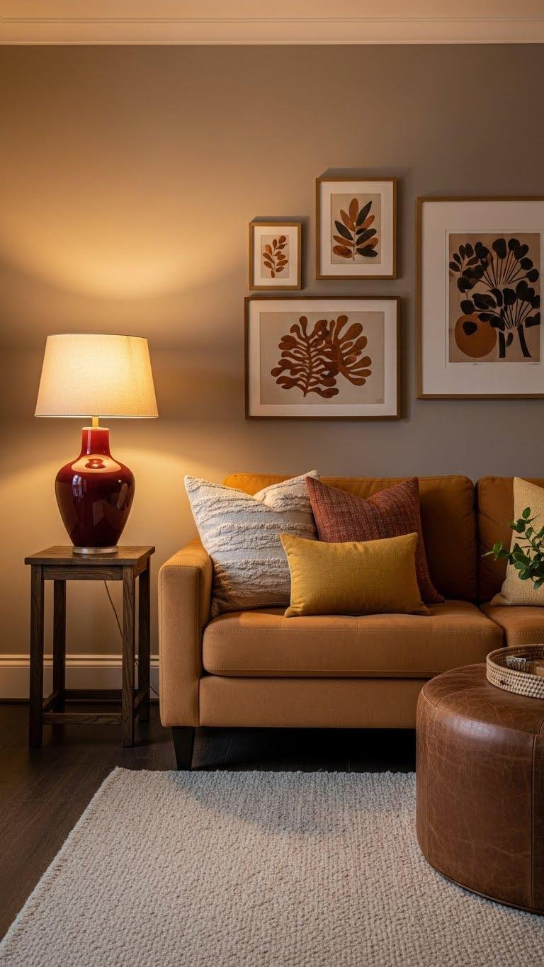 You’ll choose ochre textiles for pillows or a throw to brighten corners and pair them with oxblood accents like a lamp base or framed art. The result feels grounded, free, and modern, inviting relaxed gatherings and bold personal style.