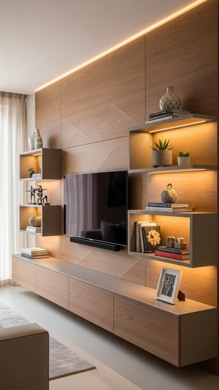 Add tailored lighting, textured back panels, and curated objects so the wall feels personal, uncluttered, and ready for how you live.