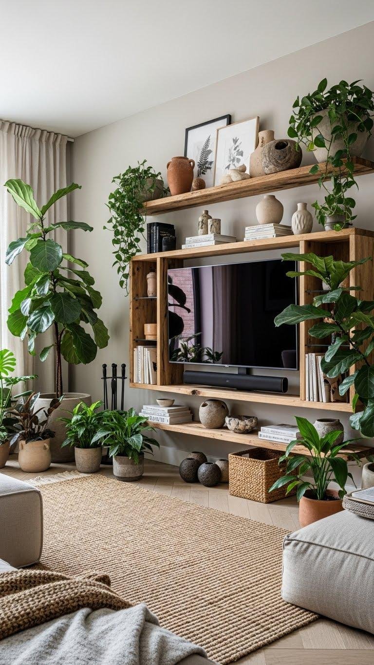 You’ve created a media wall that balances tech and curated objects; now bring the outdoors in to make the room feel alive and layered. Add indoor plantings of varied height and sculptural leaves, pair woven rugs and linen with reclaimed timber shelving, and introduce stone or clay accents.