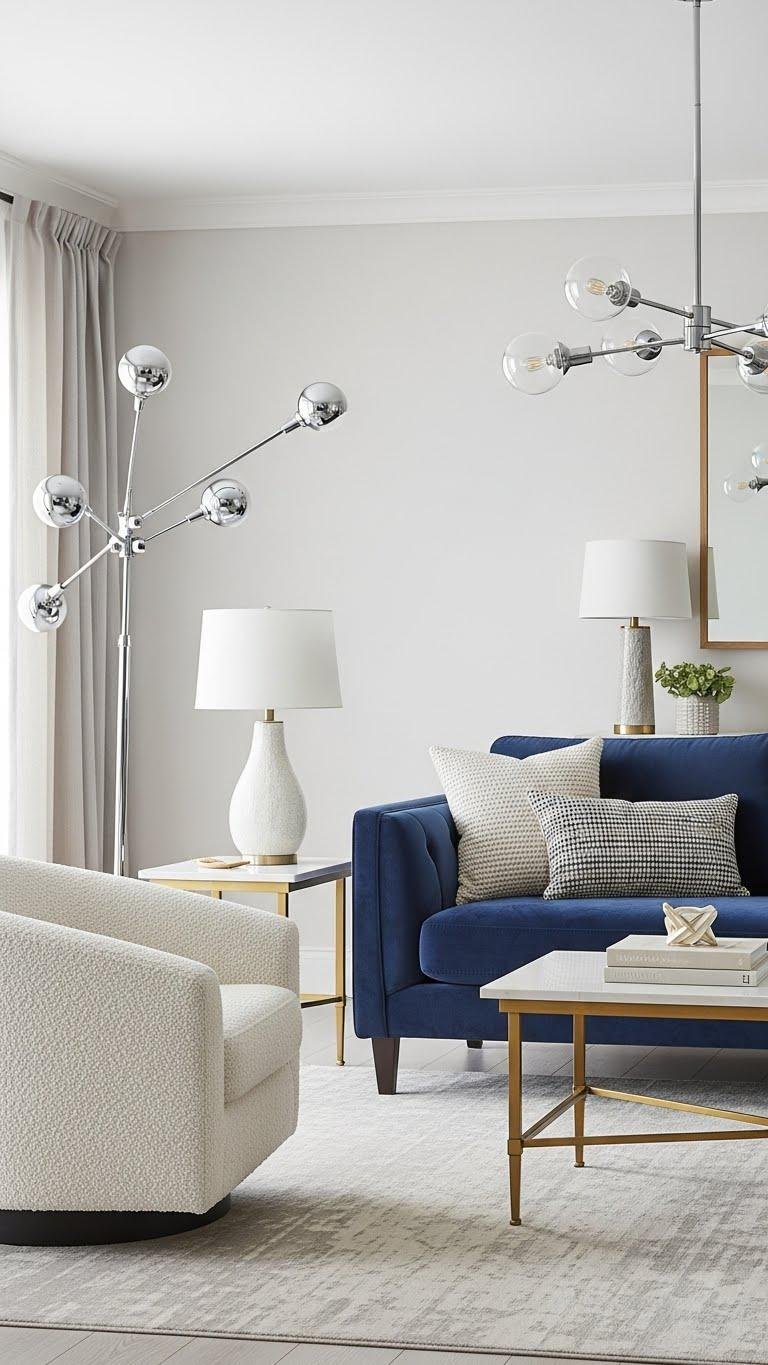 Layer plush upholstery against polished metal to create a chic tension between cozy and crisp—think velvet sofas or boucle armchairs set beside brass-legged coffee tables and chrome lighting.