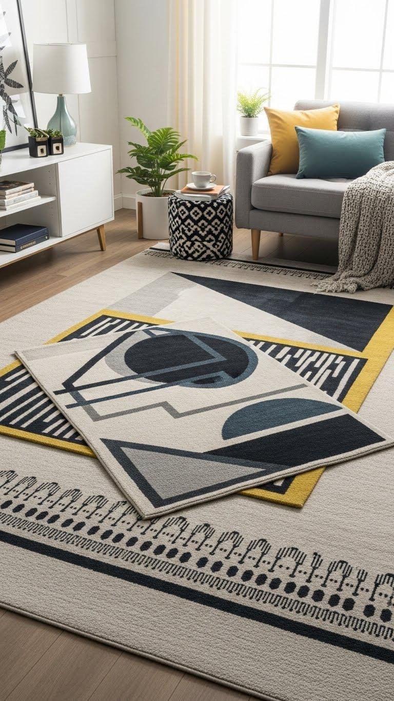 Anchor your seating with layered rugs that mix bold geometric prints to give the room instant energy and depth. You’ll use smart layering techniques: place a large neutral base rug, then add a smaller, graphic geometric piece slightly askew.