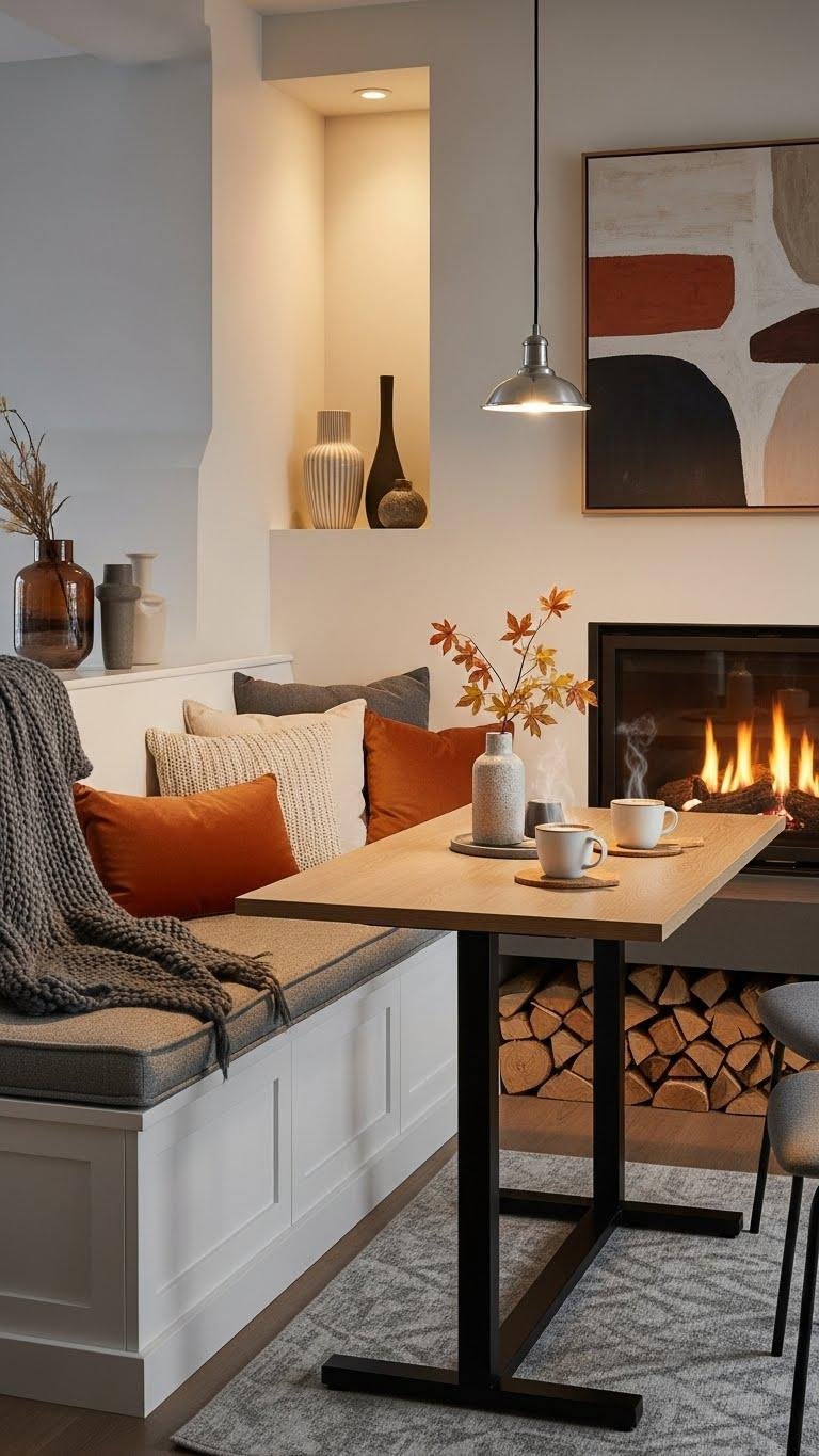 If you want a cozy, design-forward spot for morning coffee or intimate gatherings, tuck a built-in banquette into the fireplace alcove to instantly elevate the room’s architecture and function.