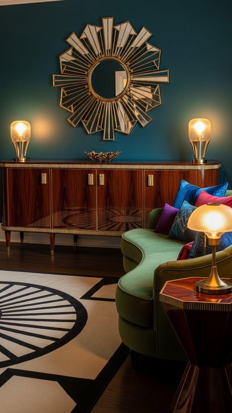 After setting mood with smart lighting, add vintage Art Deco accents to give your living room a glamorous focal point. You’ll layer geometric mirrors, velvet cushions, and sculptural side tables to evoke 1920s flair without feeling fussy.