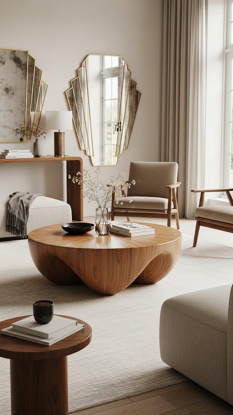Choose a low coffee table as a rounded centerpiece—think sculpted wood, marble, or rattan—to encourage flow, casual gatherings, and flexible layouts. It frees movement and adds a modern, effortless focal point you’ll actually use.