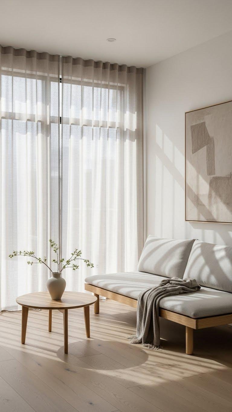 Choose linen voiles or lightweight privacy sheers hung close to the ceiling to lengthen sightlines. They let you control glare, preserve brightness, and keep a calm, unfettered vibe.