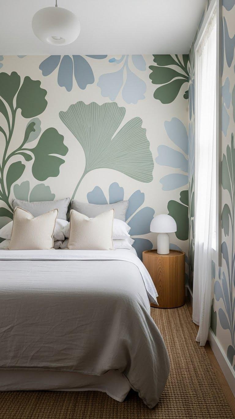 You’ll create scale contrast by pairing a bold, airy wallpaper with simple textiles.
