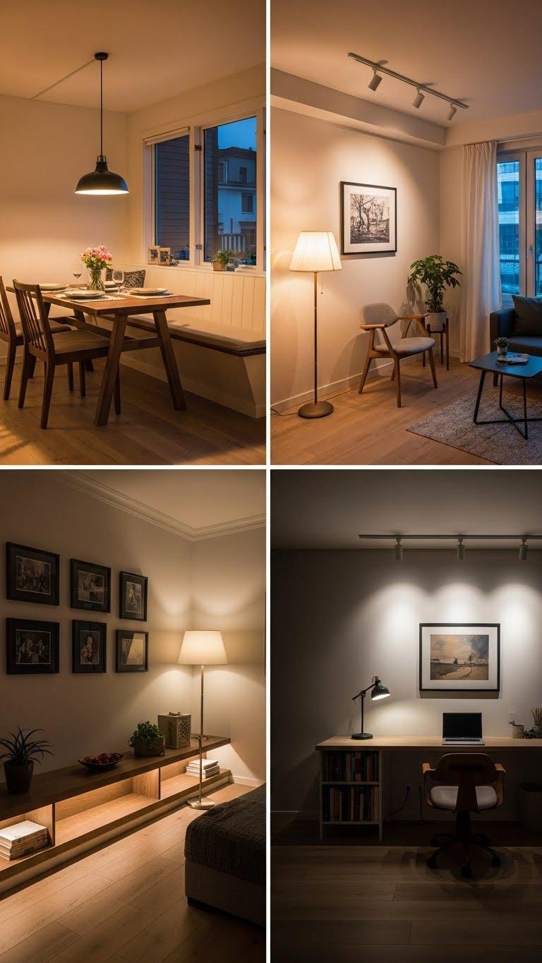 Light layering helps you define zones without adding bulk or walls. Use accent pendants over a dining nook, floor lamps for a reading corner, and track or strip lights to wash a workspace.