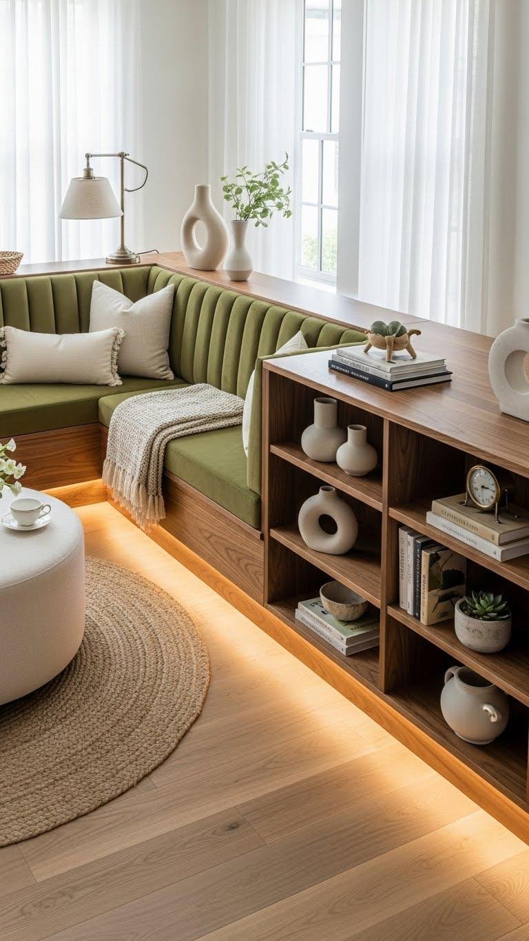 You’ll define areas without feeling boxed in: tuck seating with banquette lighting for cozy depth, or position low bookcase styling to display essentials and store clutter.