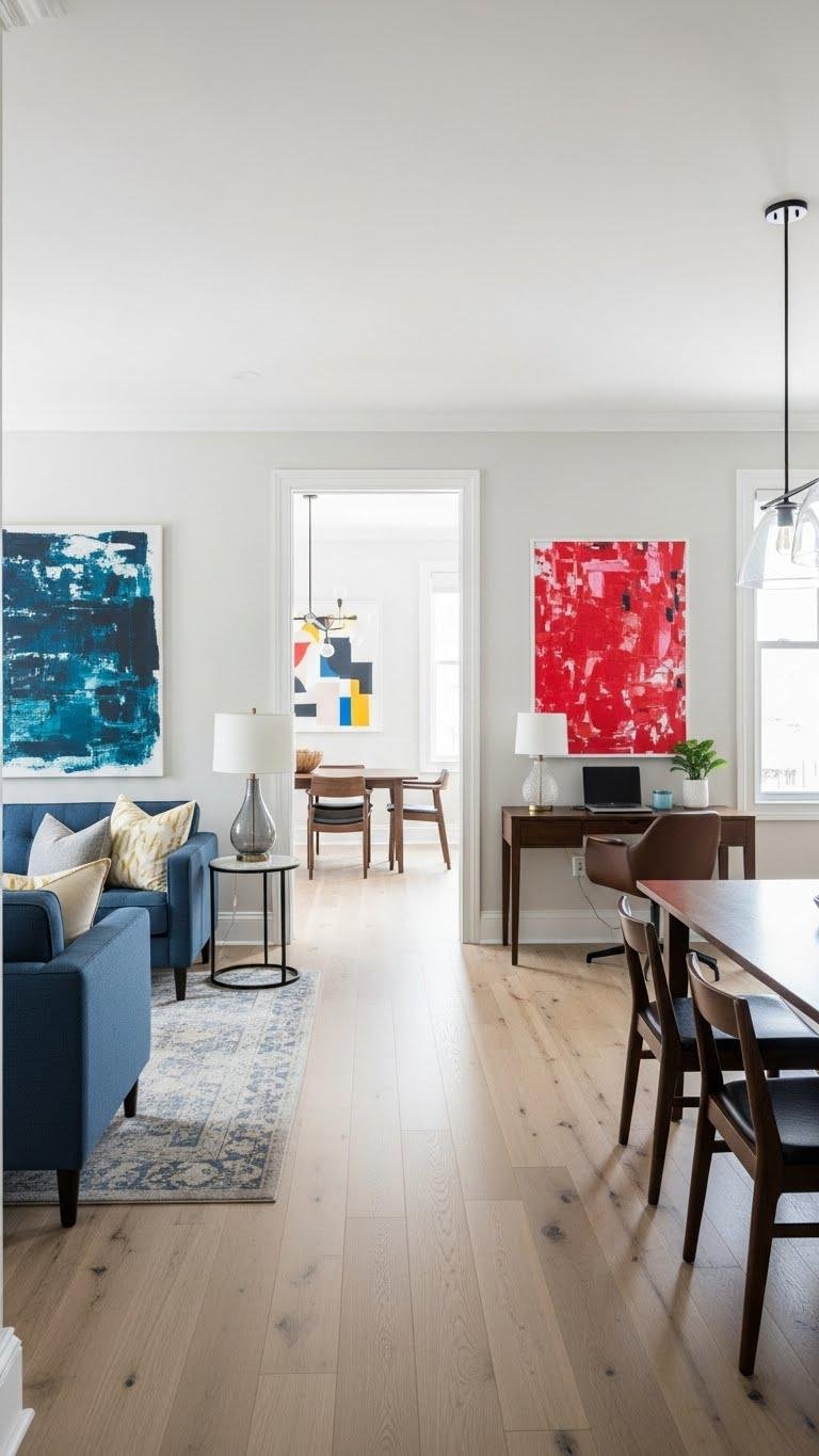 If you want the whole room to feel larger and intentional, use a unified palette to tie zones together—pick two to three core colors and repeat them in different textures and scales so each area reads as part of one composition.