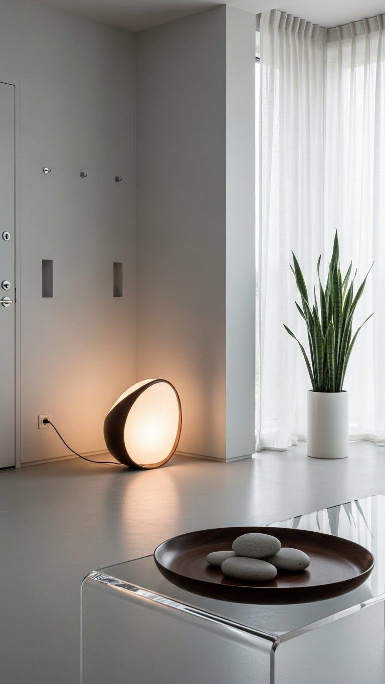 You’ll choose a few minimalist vignettes—one sculptural lamp, a single tray, a slim plant—and rely on hidden hooks for functional items. Keep surfaces intentional, rotate pieces seasonally, and let negative space act as breathing room so the room feels free and calm.
