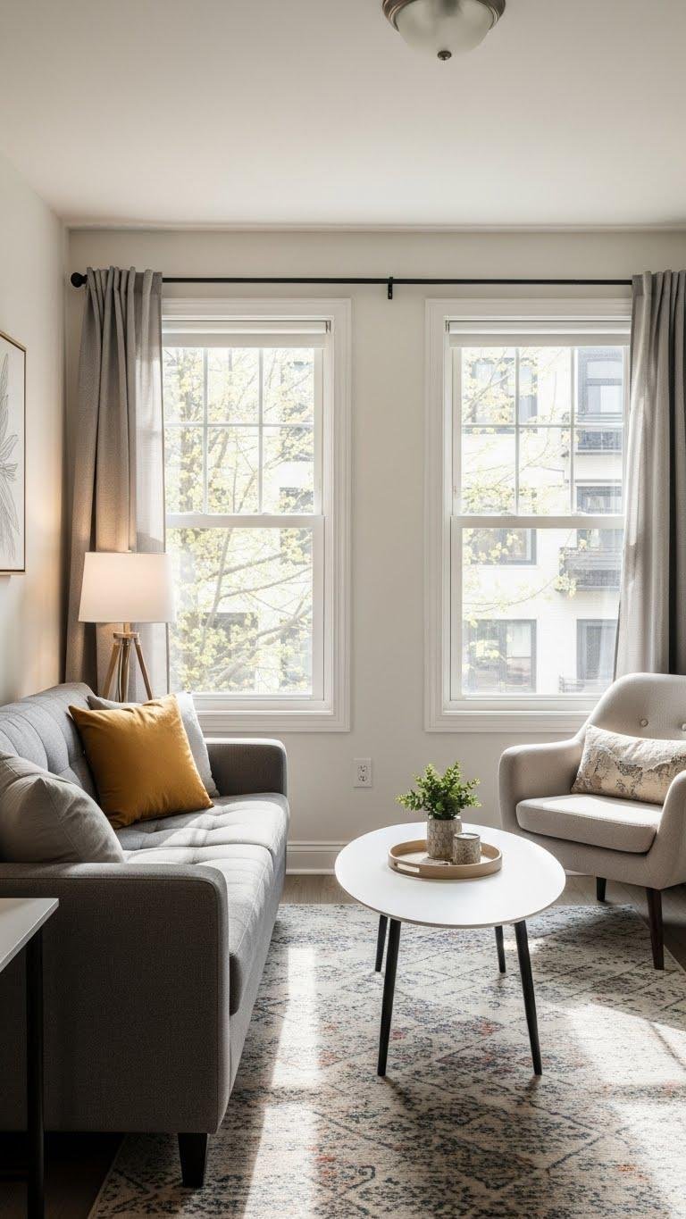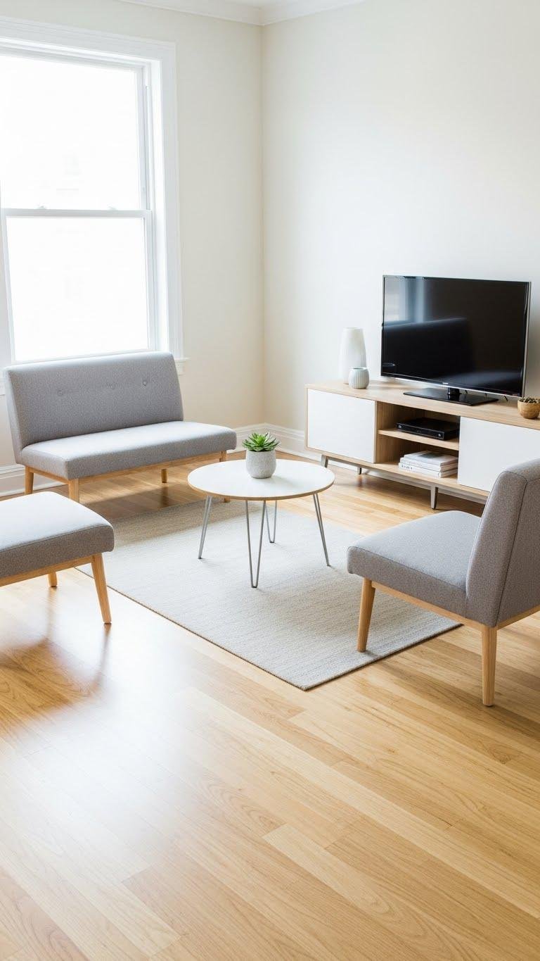 Pick furniture that breathes: smaller-scale pieces with exposed legs keep sightlines open and make a compact room feel airy. You’ll choose items with mindful scale balance so each piece complements the room without crowding.
