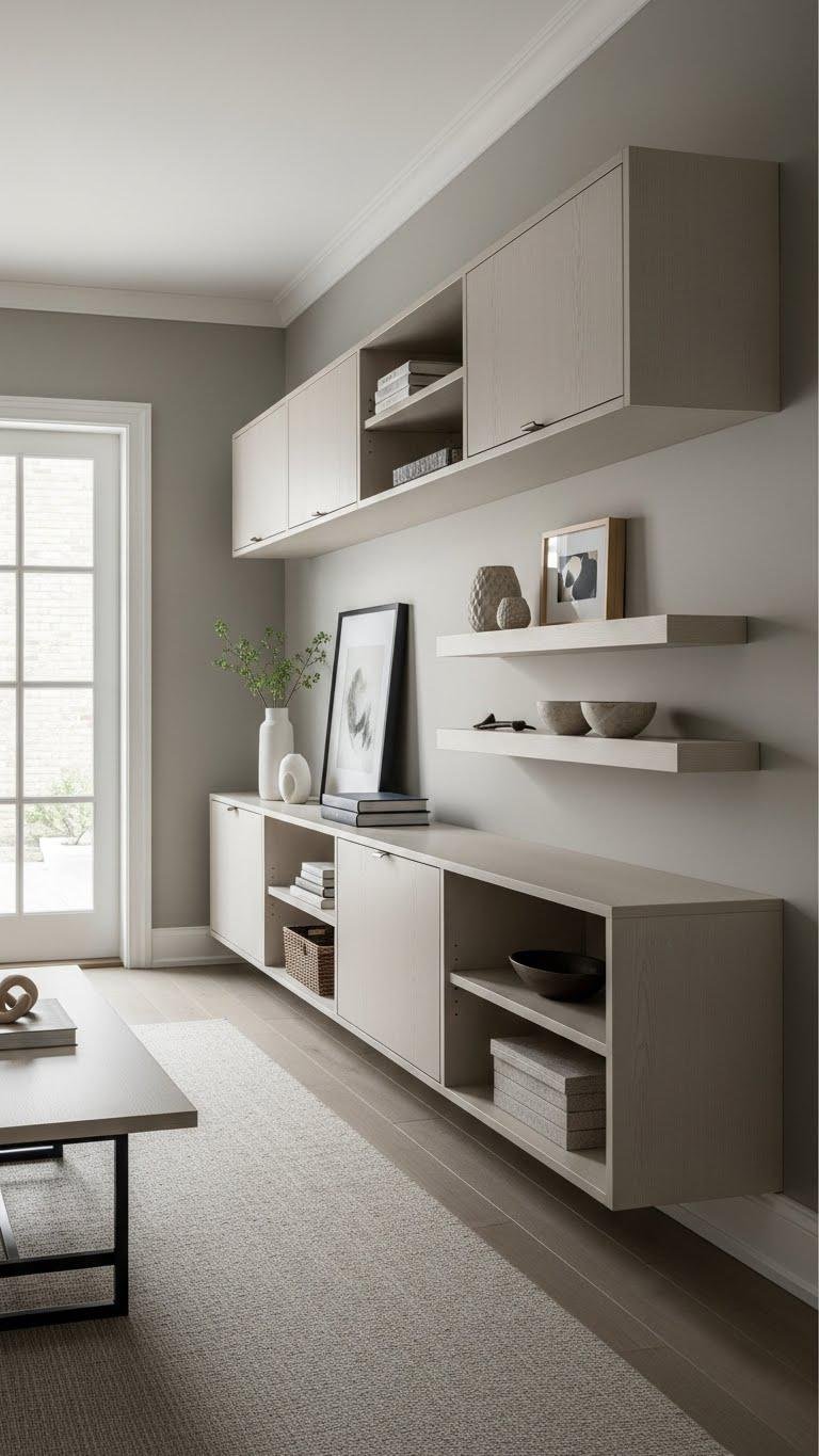 A single shallow, room‑width storage run instantly organizes without eating into circulation — think 10–12″ deep cabinets or open shelving that span the wall from door to window.